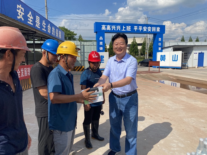 在黄山市南部城镇群水务调度中心项目、黄山生猪定点屠宰加工及配套设施项目及配套冷链项目施工现场,城投集团总裁黄世稳、党委副书记汪蓉、副总裁朱爱民等一行将慰问品送到一线职工手中,并和大家亲切交谈,细致了解大家的生活工作情况,总裁黄世稳叮嘱要注意劳逸结合,合理安排作息时间,做好防暑降温工作,确保实现安全生产。