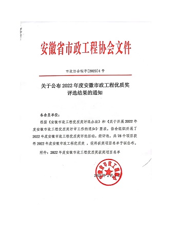 根据《安徽市政工程优质奖评选办法》和《关于开展2022年度安徽市政工程优质奖评审工作的通知》要求,安徽省市政工程协会组织开展了2022年度安徽市政工程优质奖评选活动。米兰平台-米兰(中国)