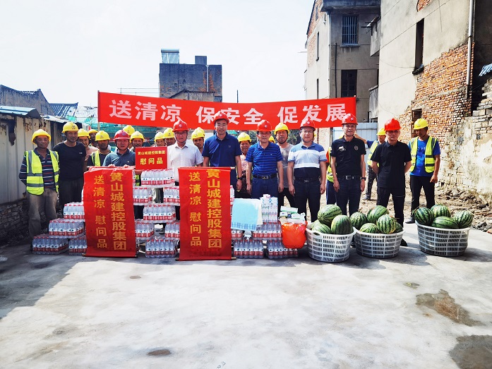 在项目施工现场,黄山城投城建控股有限公司总经理汪国文一行深入项目工地,与一线工人亲切交谈,为项目职工及作业人员发放了矿泉水、仁丹等防暑降温物品,为大家在炎炎夏日送去丝丝清凉,叮嘱一线施工人员做好高温作业个人防护,注重劳逸结合,并要求项目部认真贯彻落实安全生产责任制,自觉把安全生产放在第一位,加强施工现场隐患排查治理,深化安全事故隐患专项排查整治,相关负责同志要坚持以人为本,认真倾听职工呼声,关心关爱在高温下坚守一线的广大劳动者,把防暑降温和安全保障各项措施落到实处,做到生产、安全两手抓、两不误。