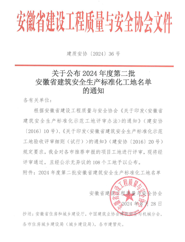 近日,安徽省建设工程质量与安全协会公布2024年度第二批安徽省建筑安全生产标准化工地名单,由米兰平台-米兰(中国)