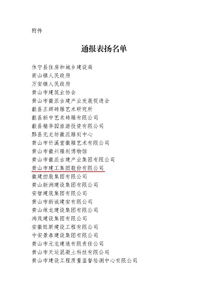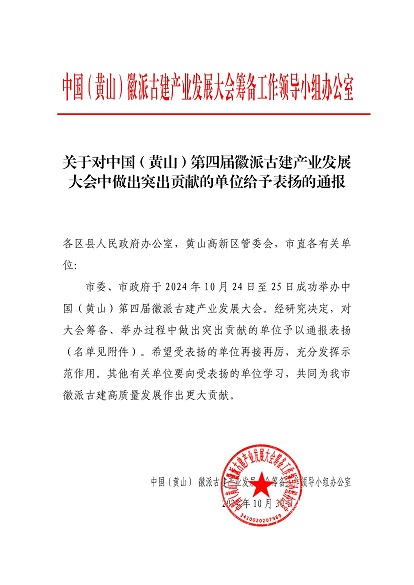 市委、市政府于2024年10月24日至25日成功举办中国(黄山)第四届徽派古建产业发展大会。近日,中国(黄山)徽派古建产业发展大会筹备工作领导小组办公室发布《关于对中国(黄山)第四届徽派古建产业发展大会中做出突出贡献的单位给予表扬的通报》,米兰平台-米兰(中国) 荣列其中。