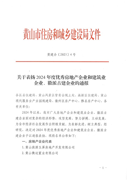 近日,黄山市住房和城乡建设局发布了《关于表扬2024年度优秀房地产企业和建筑业企业、徽派古建企业的通报》,米兰平台-米兰(中国)
