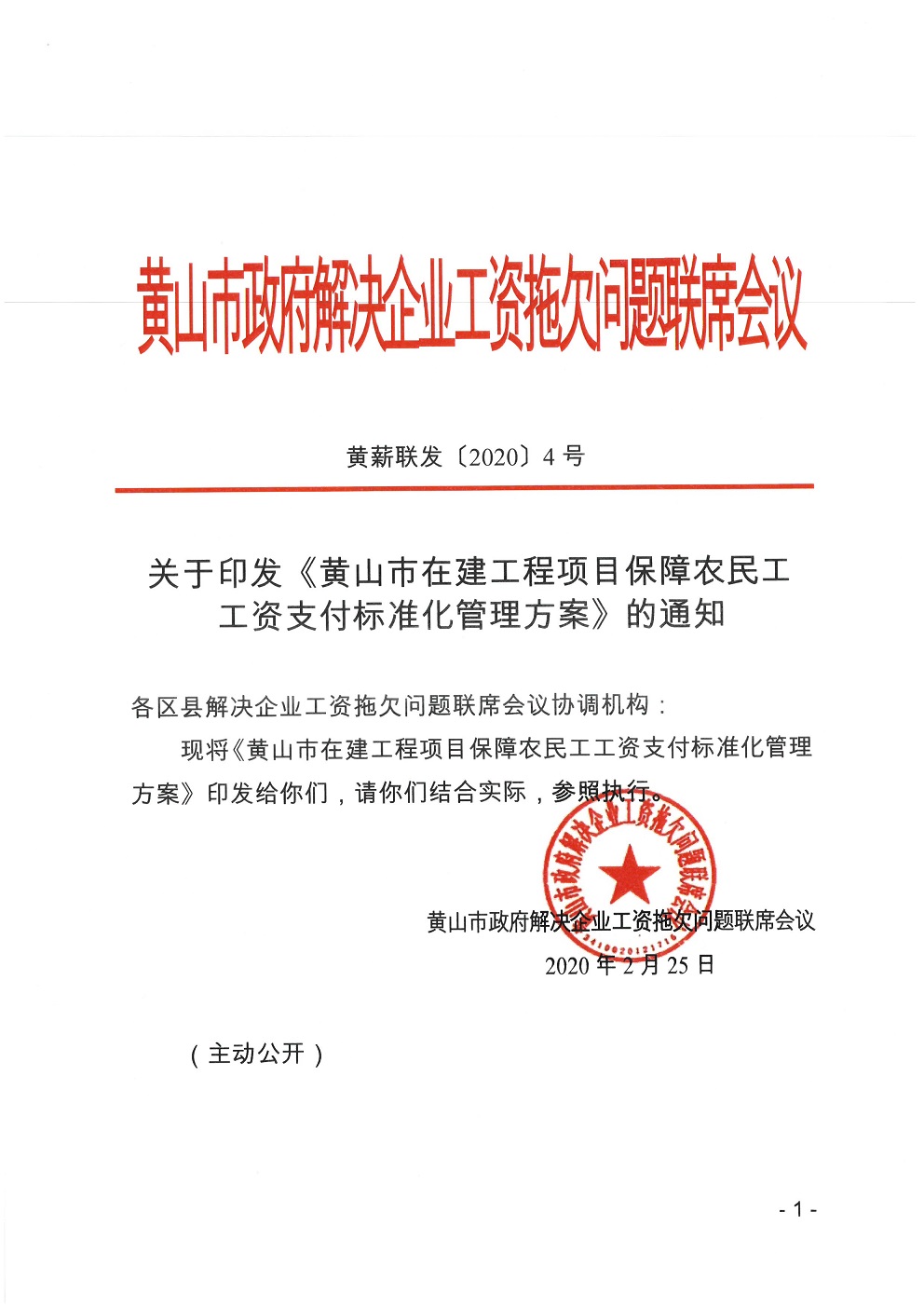 关于印发《黄山市在建工程项目保障农民工工资支付标准化管理方案》的通知.doc