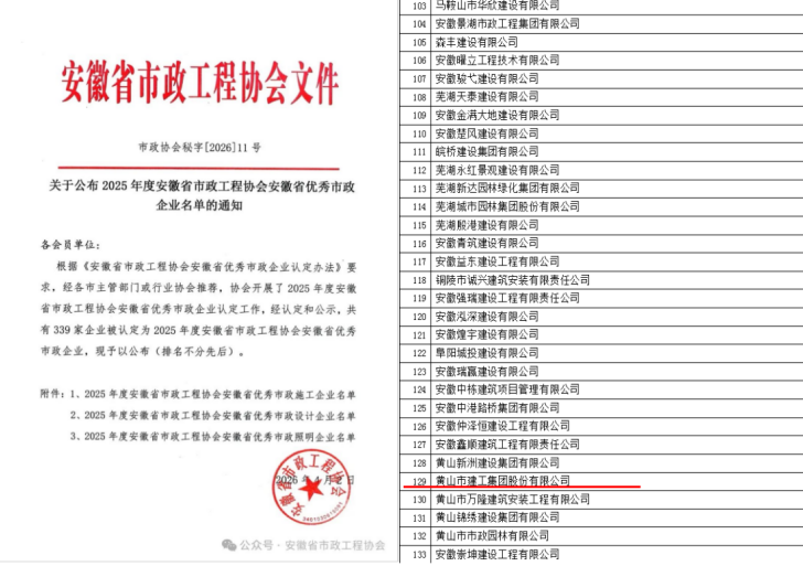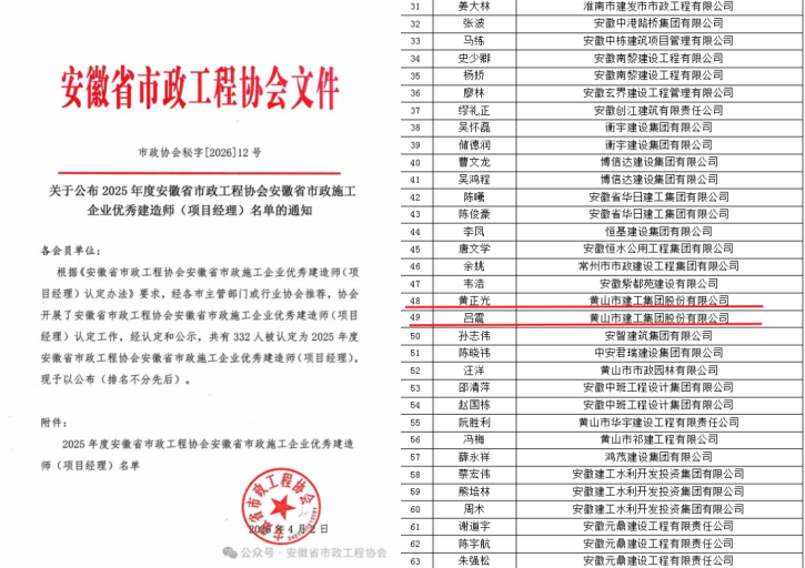 近日,安徽省市政工程协会发布了《关于公布2025年度安徽省市政工程协会安徽省优秀市政施工企业名单的通知》及《关于公布2025年度安徽省市政工程协会安徽省市政施工企业优秀建造师(项目经理)名单的通知》。米兰平台-米兰(中国) 凭借卓越的综合实力与优质的工程业绩,连续多年荣登“2025年度安徽省优秀市政施工企业”榜单。这也是继集团获“2024年度安徽省优秀建筑业企业”后,在工程建设领域收获的又一重量级荣誉。 同时,黄正光、吕震两位同志凭借扎实的专业素养和出色的项目管理能力,双双荣获“安徽省市政施工企业优秀项目经理”称号。